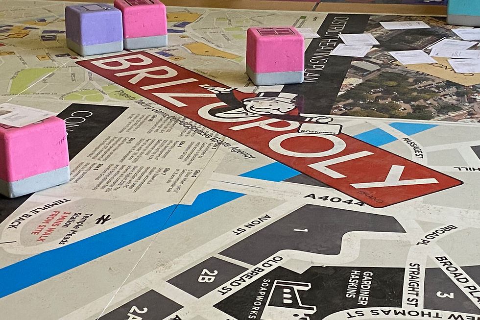 A 9.8 square metre sculptural board game commissioned for Centre of Gravity for the Old Soap Works Bristol. The audience was invited to play the role of developer, purchasing 'a derelict site' adjacent to the building and building deluxe apartment blocks.